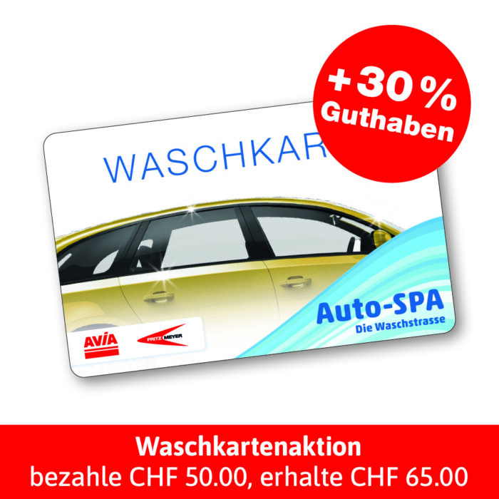 Bei der Waschkarte CHF 50.00 schenken wir Ihnen CHF 15.00. Dh. Sie bezahlen CHF 50.00 und erhalten ein Guthaben von CHF 65.00 auf Ihrer Auto-SPA Waschkarte. Zusätzlich profitieren Sie du von vielen weiteren Vorteilen: